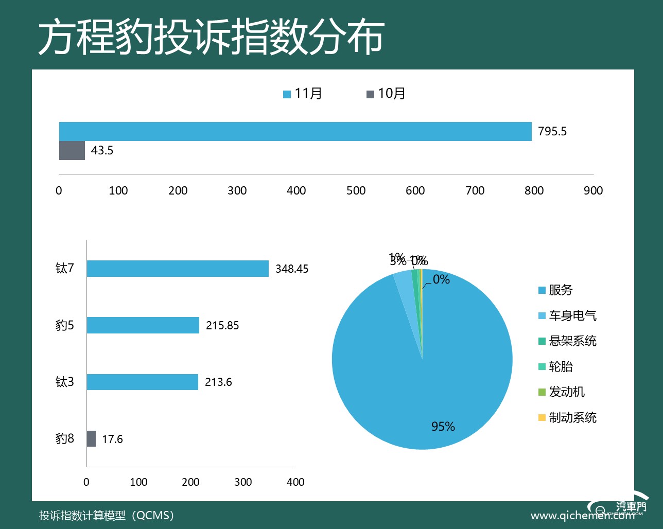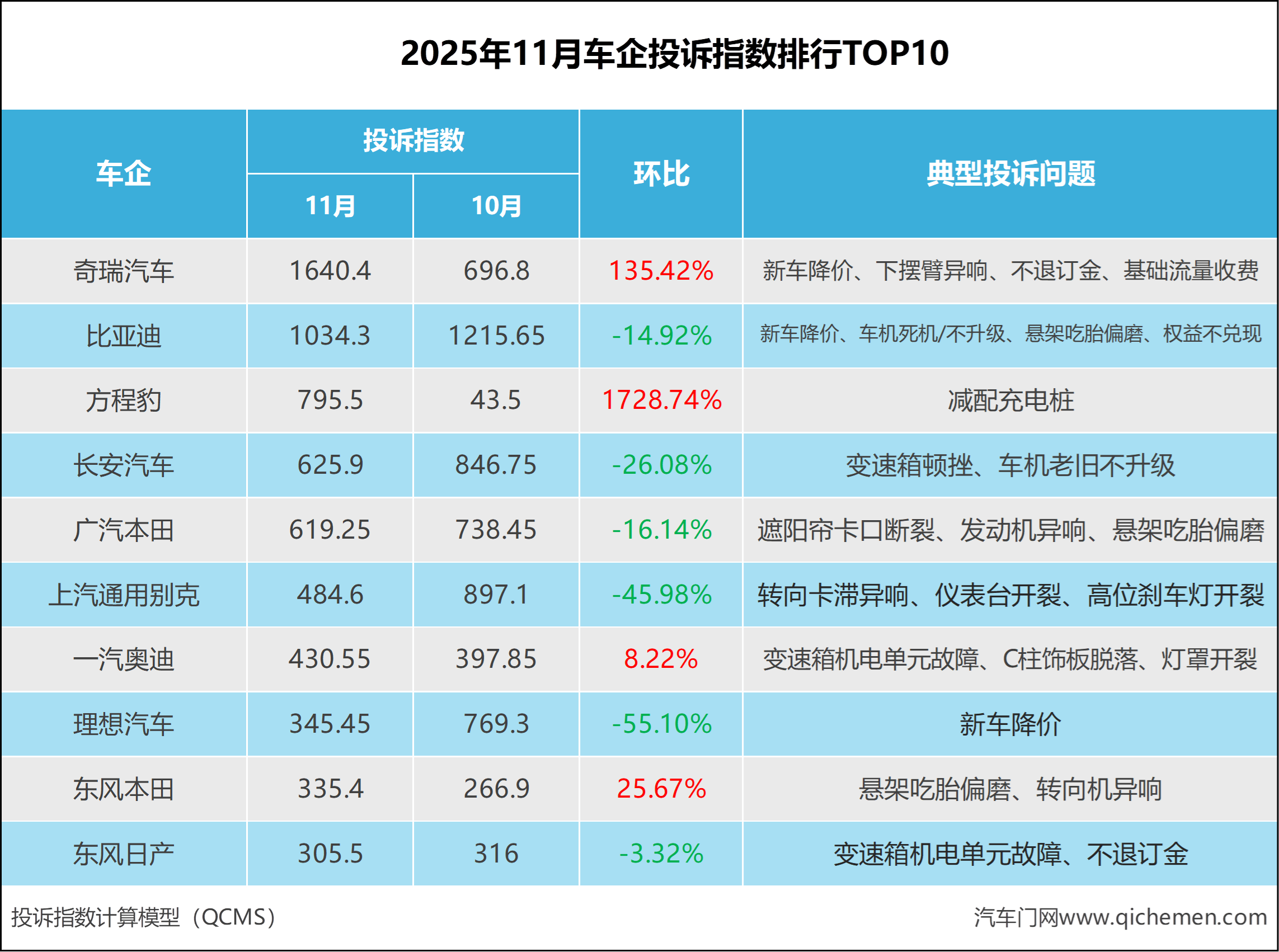 11月份,奇瑞汽车冲上了投诉榜首,投诉指数翻了一倍有余。本月中上市的风云A9L上市后降价引发车主集中投诉直接推高了奇瑞的整体投诉指数。近来投诉指数不断下降的比亚迪顺势退居第二。不过,比亚迪旗下的方程豹异军突起冲到第三,减配充电桩遭到了钛7、钛3和豹5车主的集中投诉。本月投诉榜TOP10中的多数车企投诉指数均大幅下降,且未现集中投诉。