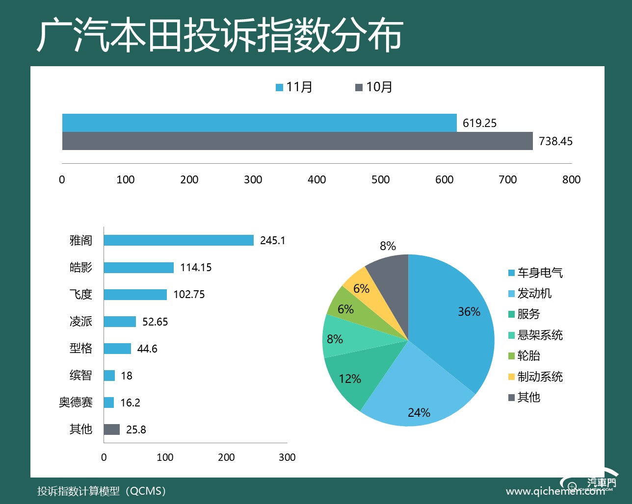 汽车质量投诉点评:11月,广汽本田的投诉指数继续稳定运行。不过,广汽本田的“痼疾”投诉集中度仍然很高。雅阁的投诉指数再次超过了200、皓影和飞度的投诉指数也都超过了100。雅阁悬架吃胎偏磨、皓影遮阳帘卡口断裂和飞度发动机异响三大问题仍在被车主集中吐槽。