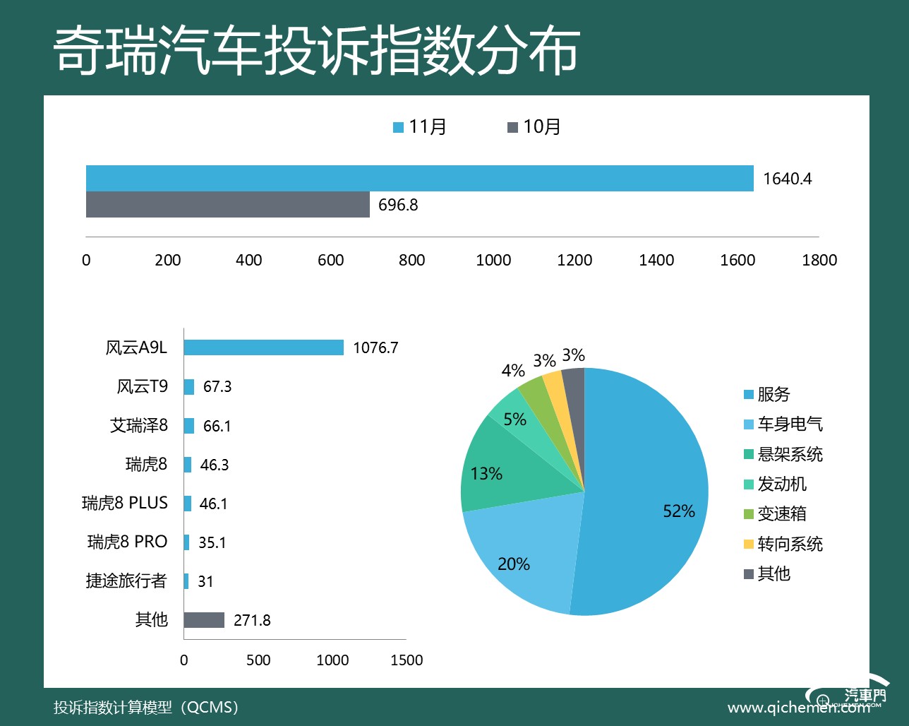 汽车质量投诉点评:11月,奇瑞汽车冲到了投诉榜首。风云A9L成了核心推手。本月中,风云A9L光辉(四驱)系列正式上市。新车不仅新增了多项配置,而且售价大幅下探。见此状,刚刚购车不久的风云A9L老车主集中发起了投诉,要求厂家给出合理解决方案。与此同时,风云A9L老车型还存在下摆臂异响等问题,同样招致了老车主的不满。