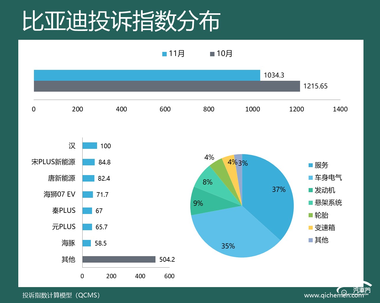 汽车质量投诉点评:由于奇瑞汽车投诉指数强势上涨,比亚迪顺势滑落到了投诉榜的第二位。本月,比亚迪依然延续着近来投诉指数持续下降的趋势,且波澜不惊。从投诉反馈来看,比亚迪的投诉集中度显著下降,多款车型的脱俗指数普遍下降到了100以下,新车降价、车机不升级、悬架吃胎偏磨等问题的投诉案例都大幅降低。
