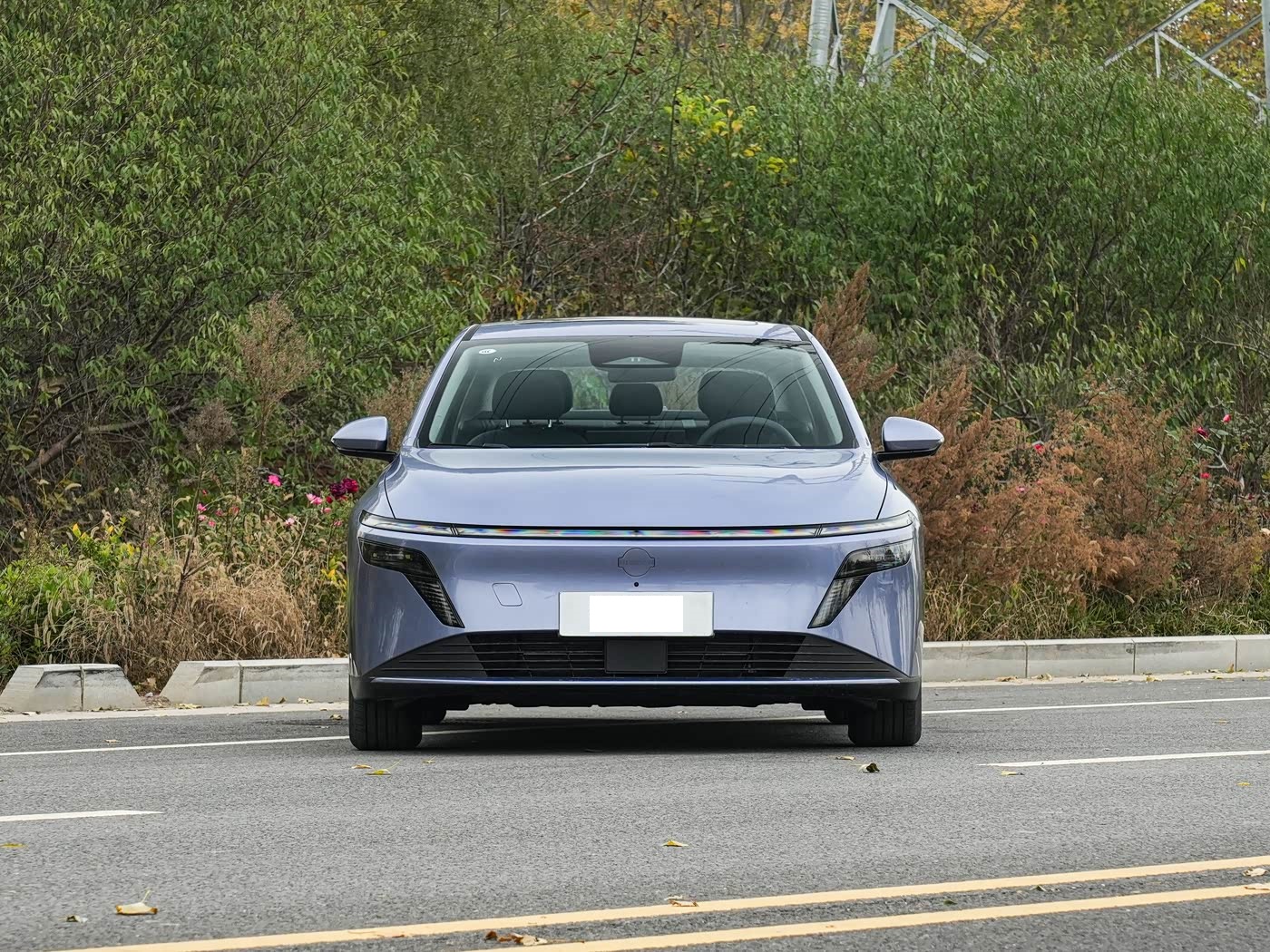 我们首先来看新车的外观设计方面,N6 采用日产 “星环美学” 设计语言,前脸的 V-Motion 家族化轮廓辨识度十足,贯穿式 LED 灯带与 “7” 字形分体式大灯形成巧妙呼应,发光品牌标识在解锁时缓缓点亮,营造出恰到好处的科技氛围。与纯电车型 N7 相比,N6 的大灯方向反向设计,虽少了几分激进,却多了家用车的亲和力。下方贯通式熏黑梯形下格栅搭配突出的运动前铲,让沉稳的前脸增添了几分张力,既符合家庭用户的审美,又兼顾年轻群体的喜好。