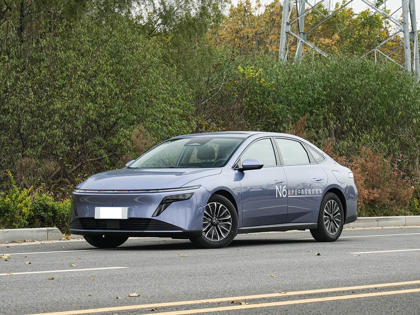 再来看车身侧面部分,车身侧面是 N6 的点睛之笔,4831×1885×1491mm 的长宽高搭配 2815mm 超长轴距,视觉上舒展修长。风弧式极简腰线贯穿全车,配合隐藏式门把手和溜背造型,不仅让车身线条利落灵动,更将风阻系数控制在较低水平,在插混车型中处于优秀水平。18 英寸熏黑轮毂搭配可选的红色刹车卡钳,进一步强化了运动属性,而相比近 5 米的 N7,N6 更小巧灵活,日常停车泊车更便捷。