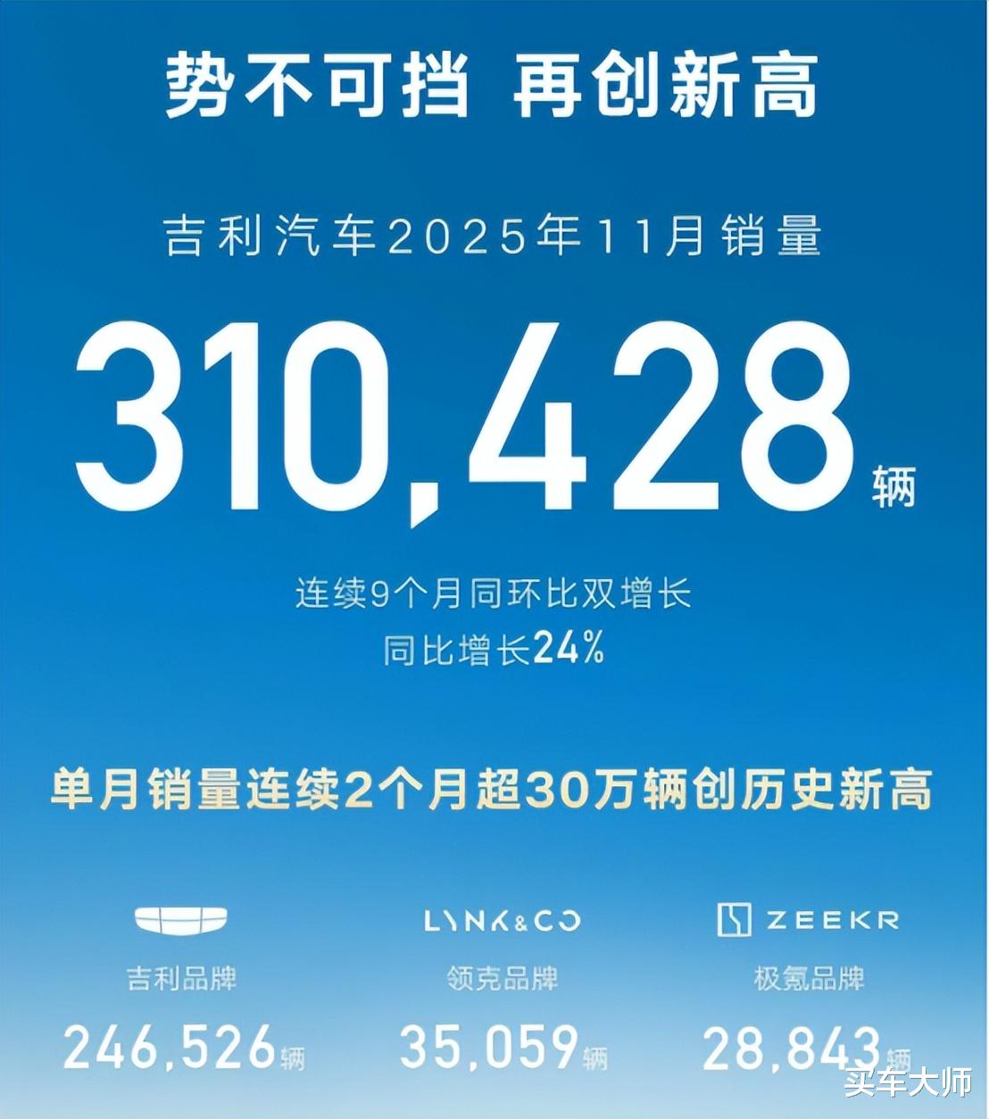 就在12月1日,吉利公布了最新的月度销量数据,其11月销量达310428辆,同比增长24%,新能源销量达18.8万辆,渗透率达60.5%,均创历史新高,还实现了连续两个月超过30万辆,以及连续9个月的同环比双增长。更早之前,吉利汽车公布的三季度财报显示,其第三季度更是实现了892亿元的营业收入,同比增长27%,创单季收入历史新高。