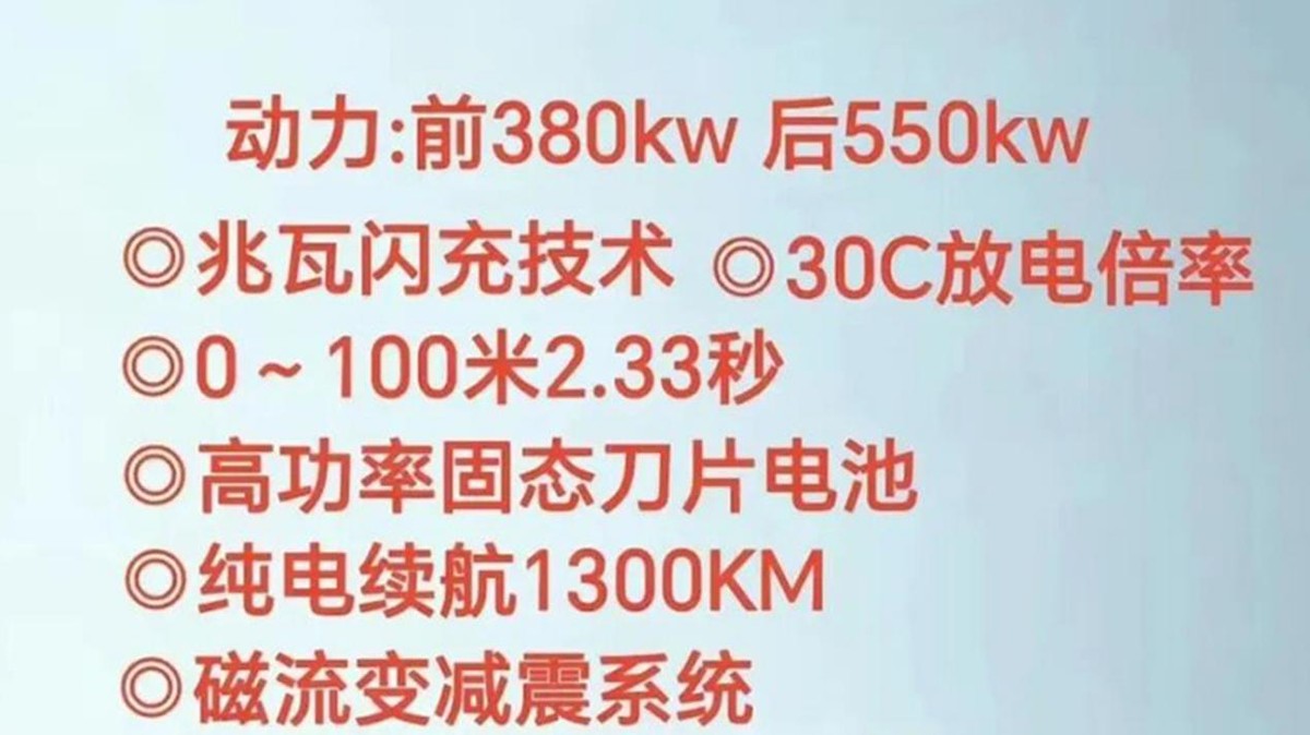 根据曝光的信息,方程豹钛系列轿车将会拥有前380km、后550kw的动力参数。与此同时,它还会配备像兆瓦闪充、30C放电倍率、高功率固态刀片电池、磁流变减震系统等一系列的黑科技配置。