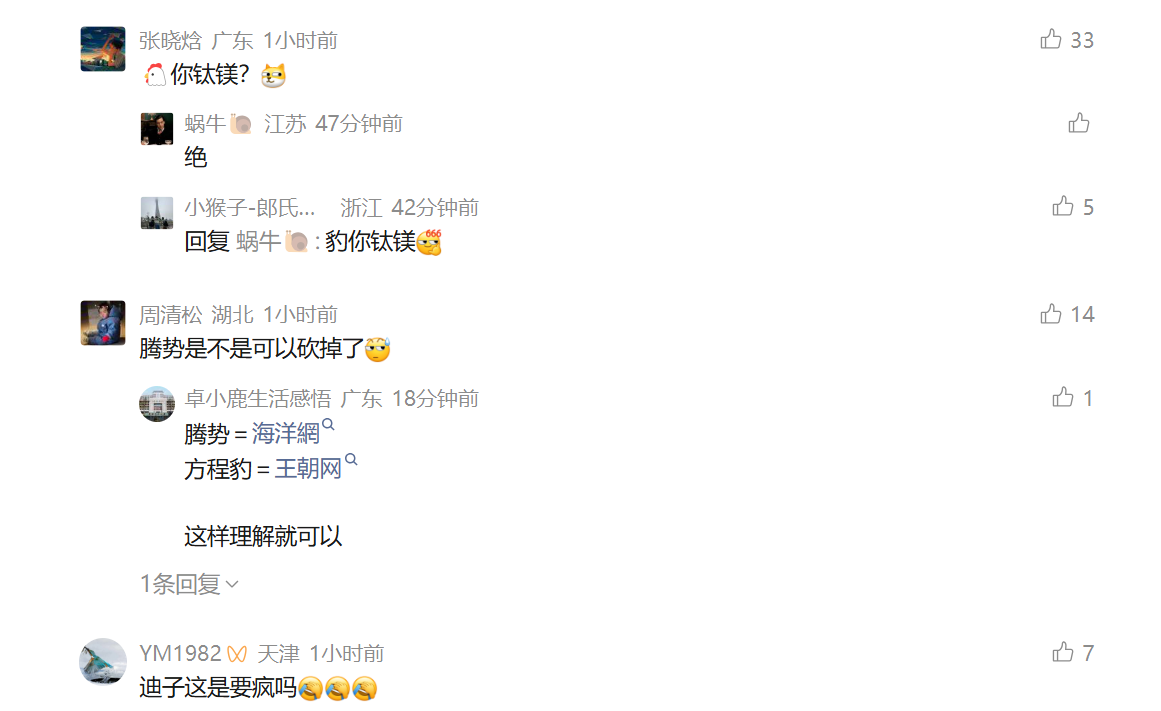 更有意思的是,在方程豹被曝出将要推出新的钛系列轿车后,网友更是直接评论道:腾势是不是可以砍掉了;迪子你这是要疯吗;太美都有了,鸡你系列啥时候出;比腾势好看100倍;豹钛镁=没爆胎。