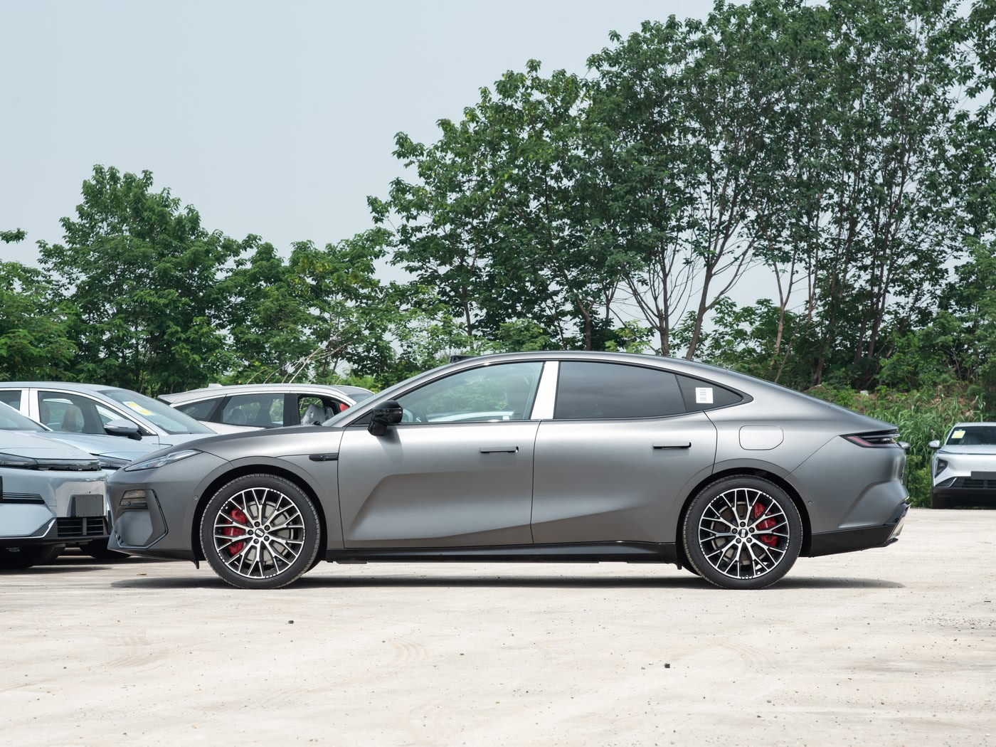 再来看车身侧面部分,车身侧面是银河 E8 专享版的核心亮点,溜背式轿跑造型搭配流畅舒展的腰线,从车头延伸至车尾,营造出蓄势待发的俯冲姿态。新车采用了隐藏式电动门把手、低风阻轮毂与平整化底盘设计,20 英寸星翼流光运动轮辋搭配大陆运动卡钳,既强化了运动基因,又进一步降低风阻。车身长度超 5 米,轴距达到 2925mm,修长的车身比例让后排空间得到充分保障,同时 C 柱位置的流畅过渡避免了溜背车型常见的头部空间压抑问题。新增的空濛蓝车身颜色以西湖晴空为基调,采用多层珠光漆工艺,在不同光线照射下呈现细腻质感,配合车门下方的镀铬饰条,让整车侧面在动感中透着豪华气息。