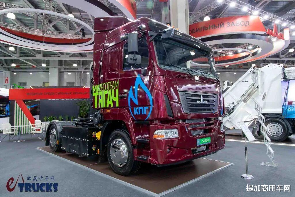 除卡玛兹之外,白俄罗斯也有一家著名的卡车制造商:MAZ,也就是明斯克汽车厂,国内一般把这个品牌称作马兹。在本届车展上,MAZ带来了新款MAZ-54402N牵引车。该车使用CNG压缩天然气为燃料,在天然气资源丰富、价格低廉的俄白市场具备显著的运营成本优势。虽然MAZ未公开具体动力配置,但从其配备的中国产气瓶等部件推断,核心系统很可能同样来自中国供应链。