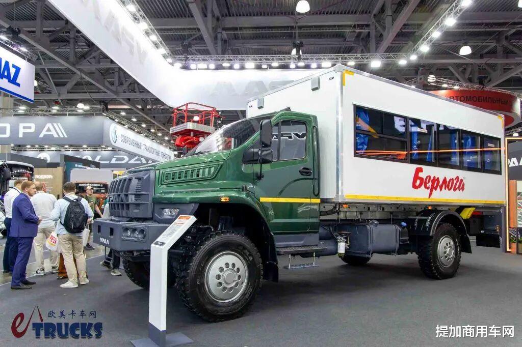 Ural NEXT车型已经发布多年,急需对其更新换代。因此,乌拉尔于去年年底启动了新车型的开发。在本届车展上,取代Ural NEXT的新车型:Ural-80迎来亮相。这款车型延续了Ural NEXT的长头式车身结构及并列三座驾驶室设计,换装新的YaMZ-535柴油发动机,功率提升至238马力,燃油经济性亦有所改善。展车搭载客运车厢,可容纳20人,适用于偏远地区通勤和旅游。