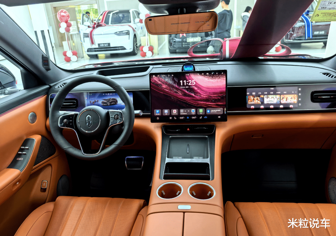 内饰设计焕然一新!新车搭载了16.1英寸的中控大屏,10.25英寸的全液晶行车电脑,还拥有分辨率高达3k的副驾驶娱乐屏幕,整个内饰的屏幕较多,因为搭载的是鸿蒙数字座舱,屏幕以及智能化的程度自然非常高。此次主推的就是棕色内饰,豪华感还是极为不错的。值得一提的是,这款问界M7还采用了零重力座椅设计,舒适性不错。此外,第2排还拥有17.3英寸的吸顶大屏功能,语音控制系统,触屏更是一应俱全。值得一提的是,这款问界M7还匹配了车载冰箱功能,全系标配按摩设计,舒适性的配置非常理想。