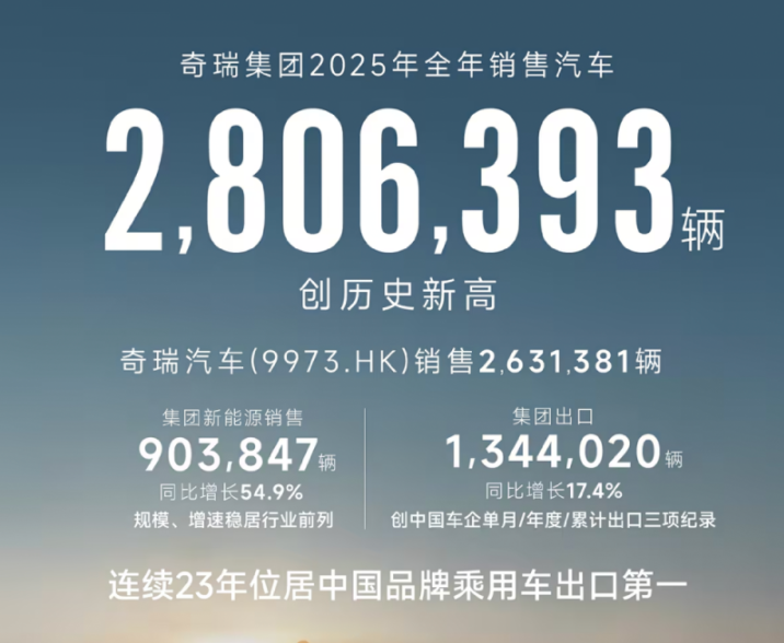 奇瑞集团延续着2024年的强势势头,其在2025年销量达到280.64万辆,同比增长超7.8%,首次超280万大关,虽然没能达成326万辆的目标,但是依旧创下了新纪录。出口方面是奇瑞集团的强项,全年出口汽车134.4万辆,同比增长17.4%,连续23年位居中国品牌乘用车出口第一。