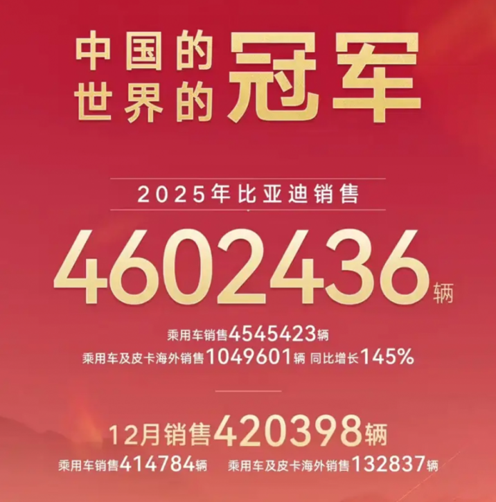 从各个维度来看,比亚迪都是最耀眼的存在。首先,460.24万辆的年销成绩,当仁不让地成为中国市场销冠,更是全球销冠。其次,比亚迪纯电车型全年累计销量为225.67万辆,同比增长27.86%,首次在全年纯电车型销量上超越特斯拉的163万辆,登顶全球第一。所以用“王者”来比喻比亚迪在2025年的表现可谓是一点都不夸张,这谁看了都望尘莫及。