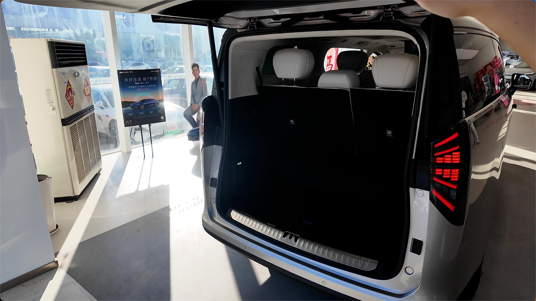 银河V900行李箱空间确实挺大,即便在第三排座椅有台阶的情况下整体容积也可达1000L,可容纳超10个登机箱,并且地板下方还设计有163L隐藏式储物空间。