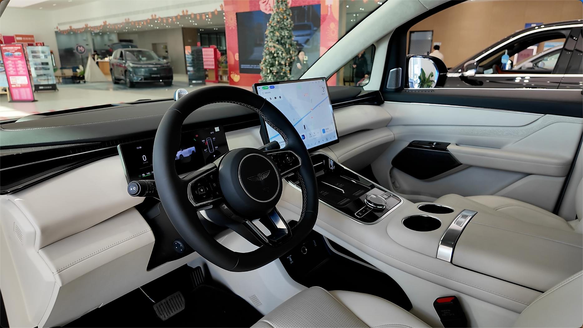 1180四驱Pro版是入门版,这个版型搭载43.3千瓦时电池组,CLTC综合续航1180公里,也就是版型名称中的那串数字。标配了1颗激光雷达、英伟达Orin系列芯片、双侧电滑门、15.4英寸中控屏、10.25英寸仪表屏、前排座椅通风预加热、后排小桌板、14个扬声器音响系统等。