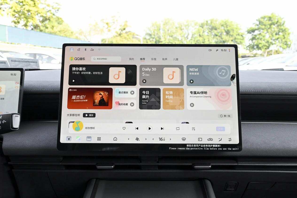 车内,中控台面与门板相连,形成环抱式座舱,有较强的包裹感,中控台层次丰富,极简风格打造,简化按键和旋钮,怀挡释放马鞍区空间,提供手机无线充电和杯架,配备双辐式多功能方向盘,10.25英寸液晶仪表和14.6英寸2.5K分辨率中控屏。提供米白和雅黑两种内饰配色供选择,车内软性材质包覆面积达到2.8平方米,触手可及的地方都是软包,档次感挺高,用料环保健康,达到母婴级标准,配备256色氛围灯,支持音乐律动功能。
