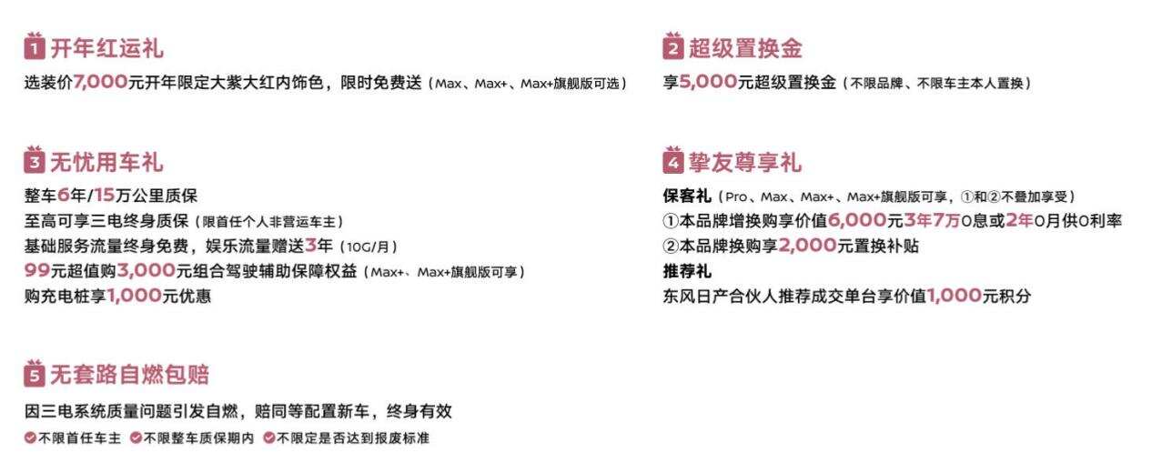 目前,东风日产官方提供限时至高12000元购车权益和无套路自燃包赔,提供整车6年/15万公里质保,首任个人非营运车主更可享三电终身质保,基础服务流量终身免费等。另外还提供有无套路自燃包赔政策,因三电系统质量问题导致车辆自燃,直接赔付同等配置新车,条款清晰,无额外限制且终身有效。