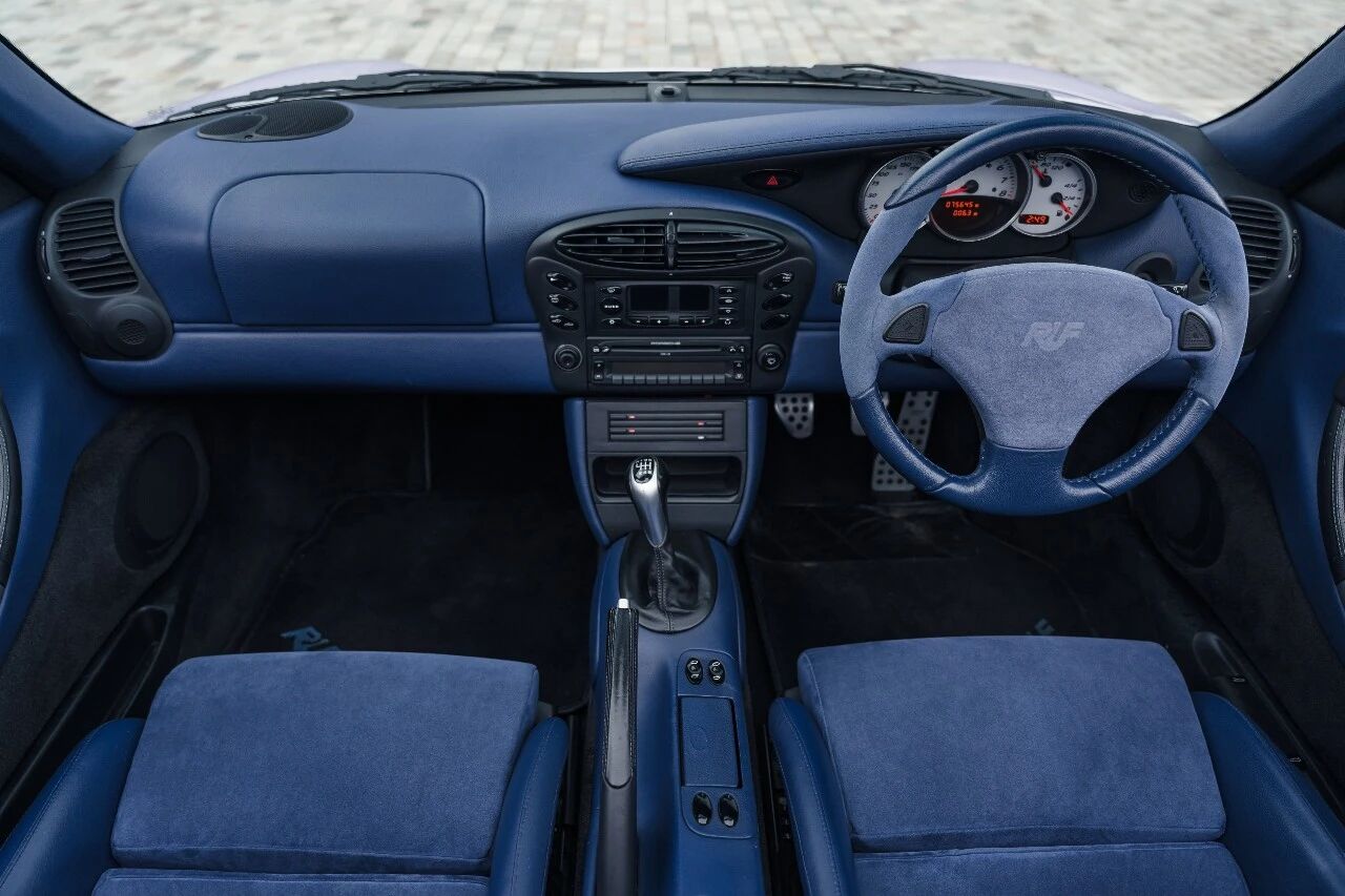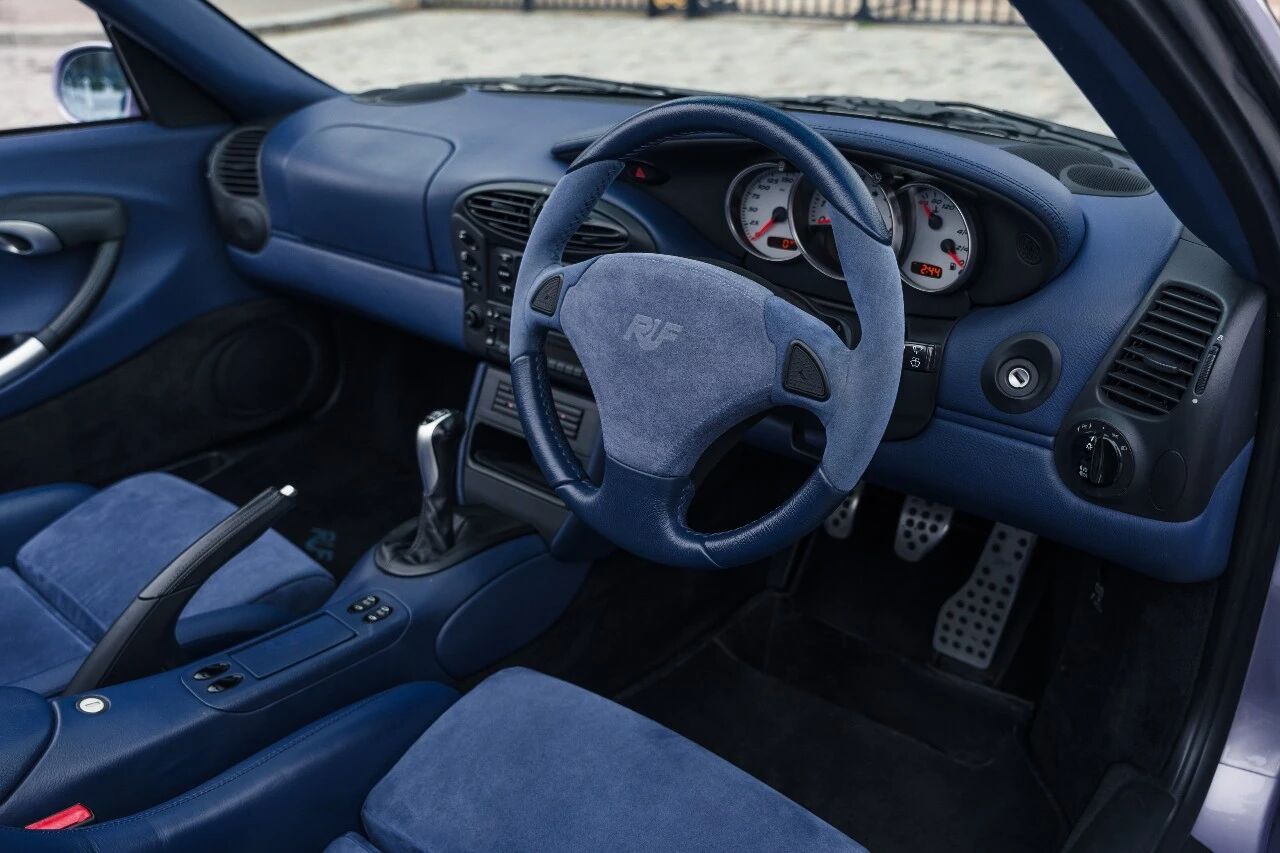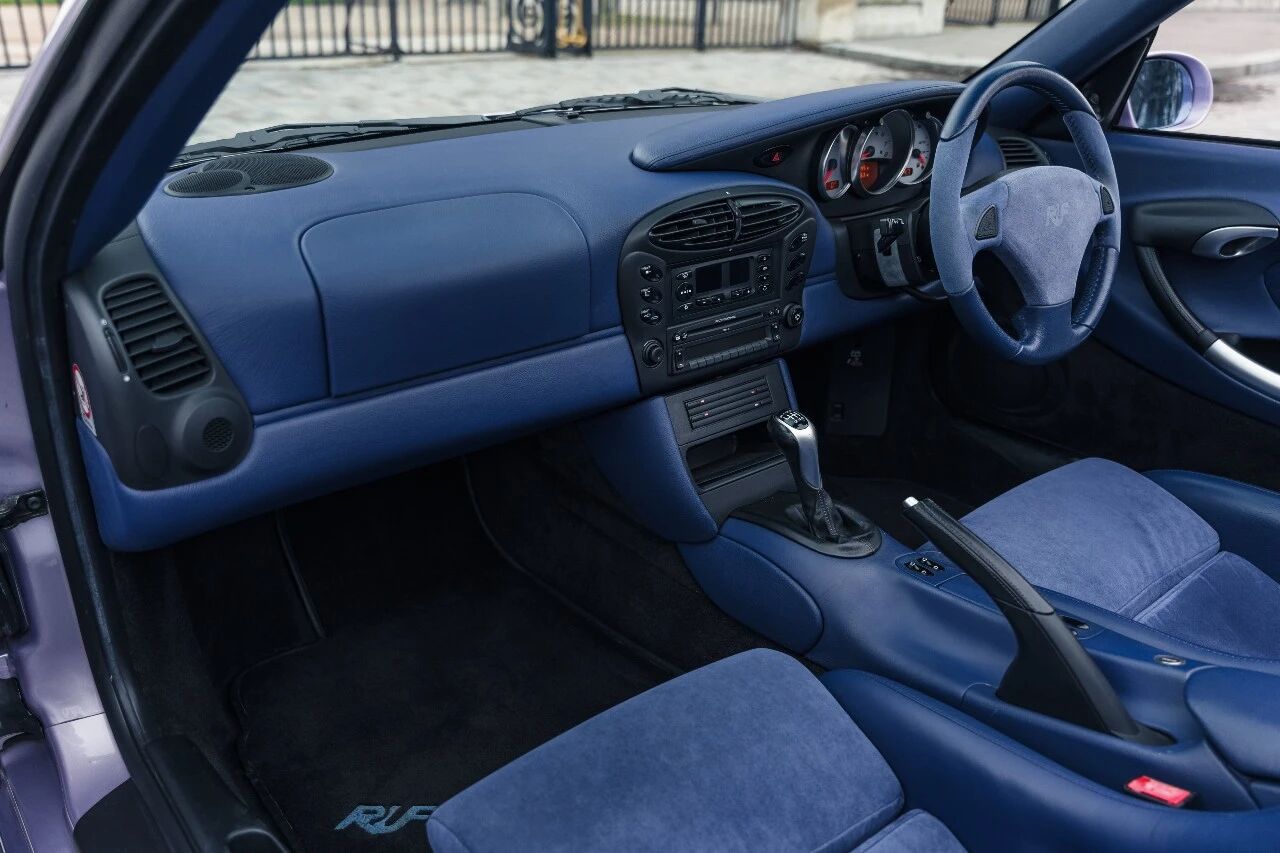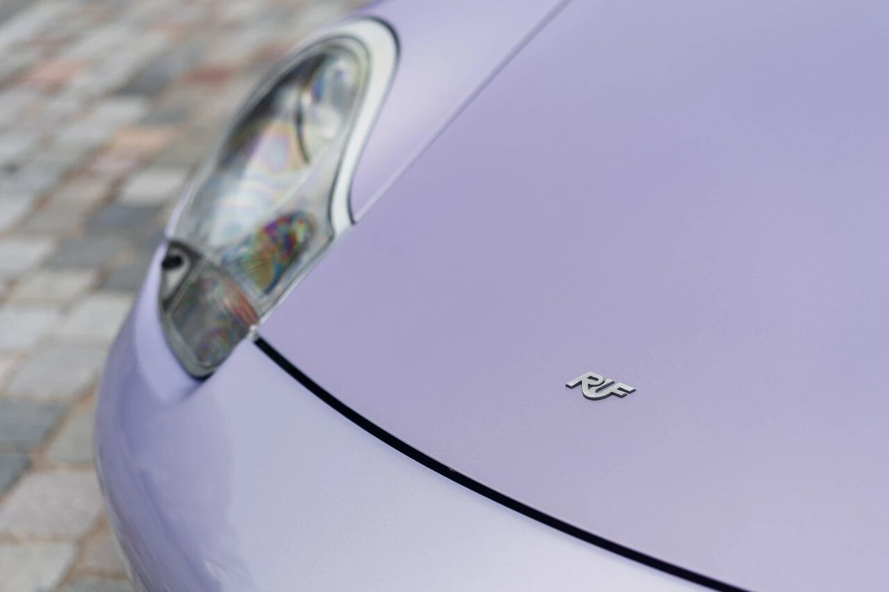 车头是淡雅的浅紫蛋白石色,向后逐渐过渡为深邃的安帕罗金属蓝,再配上同色系的淡紫色软顶,视觉效果堪称惊艳。这份“大胆到离谱”的配色方案,并非RUF的凭空想象,而是源于品牌与首任车主的深厚交情——车主希望用车身颜色,致敬自己钟爱的发色,于是RUF便为她量身打造了这套渐变涂装。这样充满“私人订制”温度的设计,在量产改装车里极为罕见,也让这台车的稀缺性再上一个台阶。