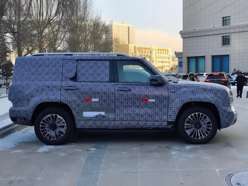 从轮圈样式来看,新车应该是配备和坦克300车系差不多大小的轮胎,再配合上方正的轮眉,预计这很可能会是一台采用非承载式(俗称带大梁)的SUV。