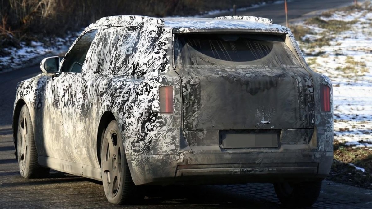 客观来说,新车的侧面结构无法给我们带来太多新东西。又是在结构比例上,这台纯电动SUV无论是长引擎舱占比,还是更大的A柱倾斜角,甚至是D柱与后风挡结构上形成的梯度变化,它与在售的库里南都极为相似。不过,若是我们从细节上对比,新车确实在变得比库里南要低矮一些,包括A柱在内的车顶边缘处置也在尝试着更柔和,这无疑是符合当下新能源车整体趋势变化的。另外,测试车的B柱下方车门位置还是没有完全平整,一段小小的突起轮廓意味着劳斯莱斯还会是坚持机械门把手,就算会引入更多智能电控解锁方式,但样式上还是会坚持所谓的“英伦绅