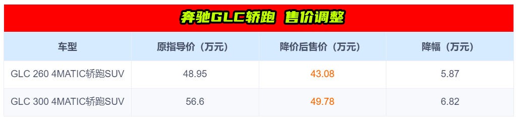 奔驰GLC 轿跑在售2款车型官降5.87-6.82万元,降价后新车最低配车型售价来到43.08万元,也是此次奔驰官降4款车型里从起步价就开