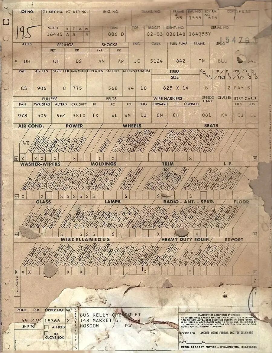 新车主入手后还发现了五张藏于车内的原厂建造单,虽保存状态不一,却实打实印证了它的原厂身份,让它成为目前现存文档最详实的Impala 409旅行车,收藏价值再上一个台阶。