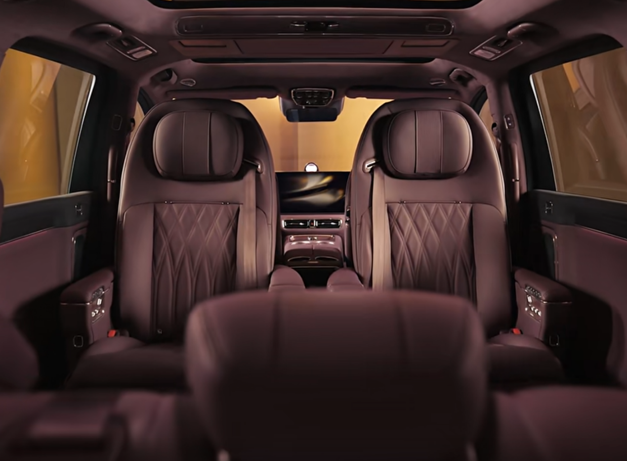 走进车内,内饰的设计根据官图显示它非常的豪华,它采用的是一体式贯穿的横向屏幕。内饰采用白栓木和胡桃木天然实木饰板,并且中控台下方还有水晶质感的按钮,与NAPPA头层真皮搭配。然后就是二排方面了,在第二排座椅上,它配备了180°电动旋转航空座椅,拥有45°的迎宾模式,旋转后与第三排形成对坐布局,这个可以让你在一些场景下有更好的沟通能力,其次它还有零重力模式加多项电动调节。最重要的是,这款车还有制氧空调系统,可以提升一些特定条件下的行驶,并且长途情况下更适合老人与小孩。