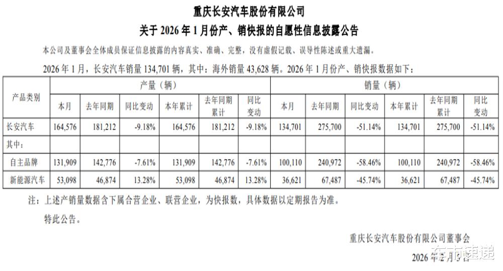 根据公开的产销快报显示,2026年1月份,长安汽车旗下自主品牌单月销量为100110台,同比下滑58.46%;新能源汽车单月销量为36621台,同比下滑45.74%。这就是长安汽车2026年开年首月的现状。