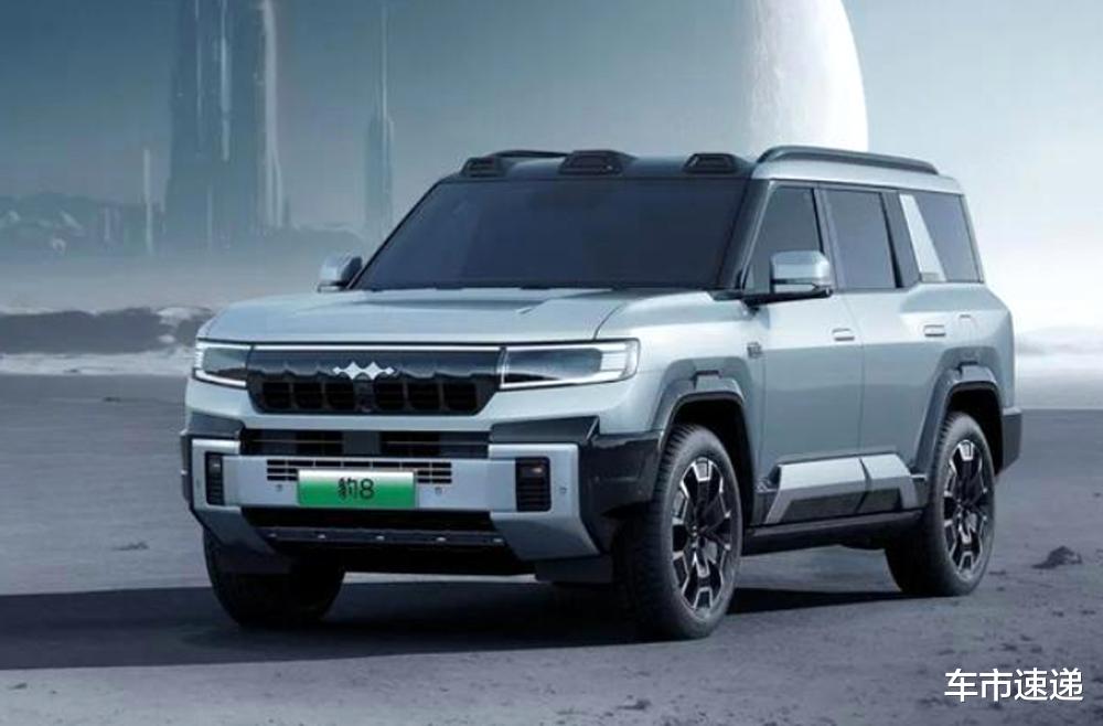 豹系列的第二款车型是豹8,月均销量在1600台左右,定位是中大型SUV,拥有5195mm车长,轴距达到2920mm,采用的是2.0T+双电机组成的插混系统,WLTC纯电续航里程100公里,电动机总功率为500kW,亏电油耗百公里为8.5L。