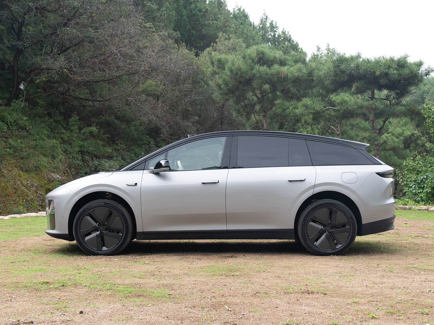 再来看车身侧面部分,车身侧面堪称“空间最大化”的典范。4950mm的长度与3000mm轴距虽属中大型SUV常规尺寸,但通过低重心设计与短前后悬布局,实现了“四轮四角”的视觉效果,运动感十足。 车顶采用悬浮式设计,搭配隐藏式门把手与低风阻轮辋(20英寸起步,高配21英寸),既降低了风阻系数,又提升了续航表现。 值得一提的是,车身提供珍珠白、外星银等五种配色,其中“小灰鲨”灰黑双色版本尤其受年轻用户青睐。