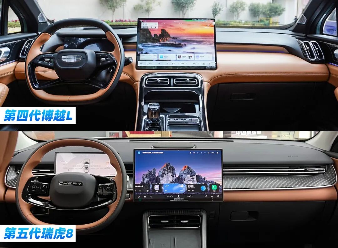 如果是中配山河车型,第四代博越L会在舒适性上加强,例如前排座椅加热、副驾电动调节、氛围灯、电动尾门、自适应远近光、蓝牙钥匙等。瑞虎8则会一些便利性硬件上加强,例如发动机启停,自适应远近光、电动后尾门等。