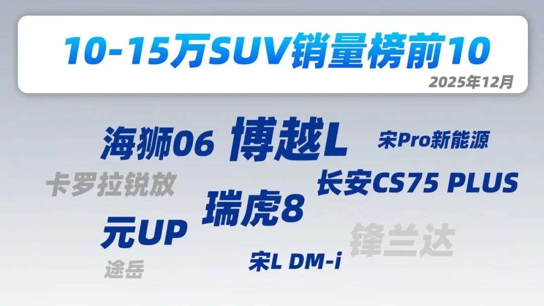 究竟有多罕见?看看2025年12月份10万级SUV销量表,2.4万辆的销量数字已经是排在“脑部”位置了。同价位的热门燃油SUV如奇瑞瑞虎8,月销约1.7万辆。