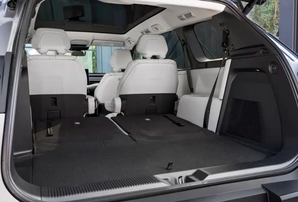 走进车内,内饰的设计风格其实和当下新能源车型的理念是很接近的,因为它选用了悬浮式的显示屏和全液晶的仪表,但是它整个内饰给人看上去的感觉,并不显得有科技感,为什么?因为它悬浮式的显示屏和悬浮式的液晶仪表感觉都比较厚重,并没有那么纤薄的感觉。其次它的换挡逻辑采用的是那种小挡把的风格,这哥也是我认为不怎么喜欢的地方。不过它的内饰也有优秀的地方,那就是整个内饰的豪华感不错,因为它选用的是米白的色调装饰,显得还是比较好看的。除此之外,这款车型的全三排座椅均采用SofTex人造皮革作为标准材质,前排座椅加热也是标准配置,前排座椅通风和第二排座椅加热均为选配。全车提供18处储物空间,第三排座椅放平后提供超过1274L的后备厢储物空间。