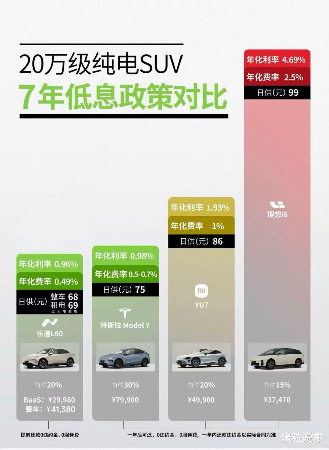 而且我们还要重视一点,目前乐道L60不仅在能耗,补能方面有优势,其实在金融权益等方面,也是对普通工薪层用户也很友好,就拿当下主流4款热门纯电SUV来说,都拥有着7年低息方案,但是很明显乐道L60不仅是月供少,利率也是很低的,用户掏出的真金白银更少了,反观其它品牌的金融政策,除了特斯拉表现还不错外,小米和理想的利率还是比较高的,如果说自己的预算比较低,乐道L60七年低息年利率低至0.49%,首付不到三万块,日供低至68元就可以开回家了。