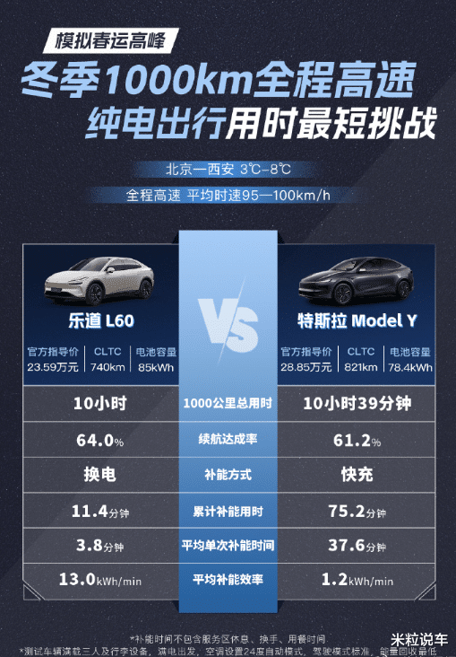 先说最终结论,乐道L60率先抵达了终点站!你知道领先多长时间吗?超出很多人的想象,乐道L60整整领先特斯拉ModelY 39分钟。在整个测试过程中,乐道L60行驶了1000公里,补能只用了11分钟。有一说一,在春运高速状态下驾驶油车都未必有如此快的补能速度。