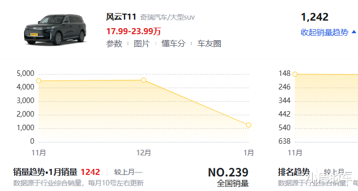 从销量端来看,银河M9在去年的第四季度曾连续三个月销量破万,在刚刚结束的1月份也是卖出了6592辆,显然更受消费者的追捧。除此之外,同价位车型中,零跑C16、方程豹钛7也都有着有着不错的市场表现,风云T11面临的竞争远比想象中的还要激烈。