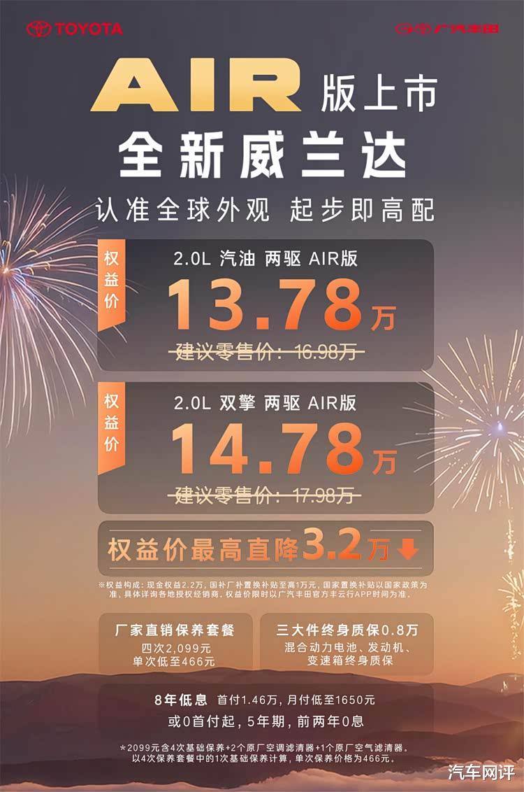 2月24日,广汽丰田全新威兰达AIR版正式上市,直接把合资紧凑型SUV的价格卷到了新高度!作为威兰达系列全新入门款,该车推出两个版本:2.0L汽油两驱AIR版官方指导价16.98万,权益价仅13.78万;2.0L双擎两驱AIR版指导价17.98万,权益价14.78万,相当于直接拉低合资SUV入门门槛3万+,刚上市就引发车圈热议——要知道,这个价位此前基本是自主品牌的天下,广汽丰田这波操作,明显是要正面硬刚国产SUV。
