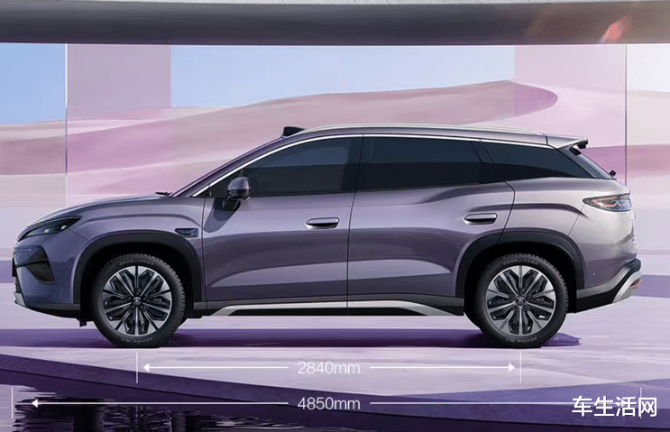 侧面采用溜背线条设计,搭配半隐藏式门把手与多辐式轮毂,兼顾动感与空气动力学需求;尾部贯穿式尾灯组融入比亚迪标志性“中国结”元素,搭配尺寸较大的扰流板,层次感丰富。尺寸方面,新车长宽高分别为4850/1910/1670mm,轴距为2840mm,定位为中型SUV。