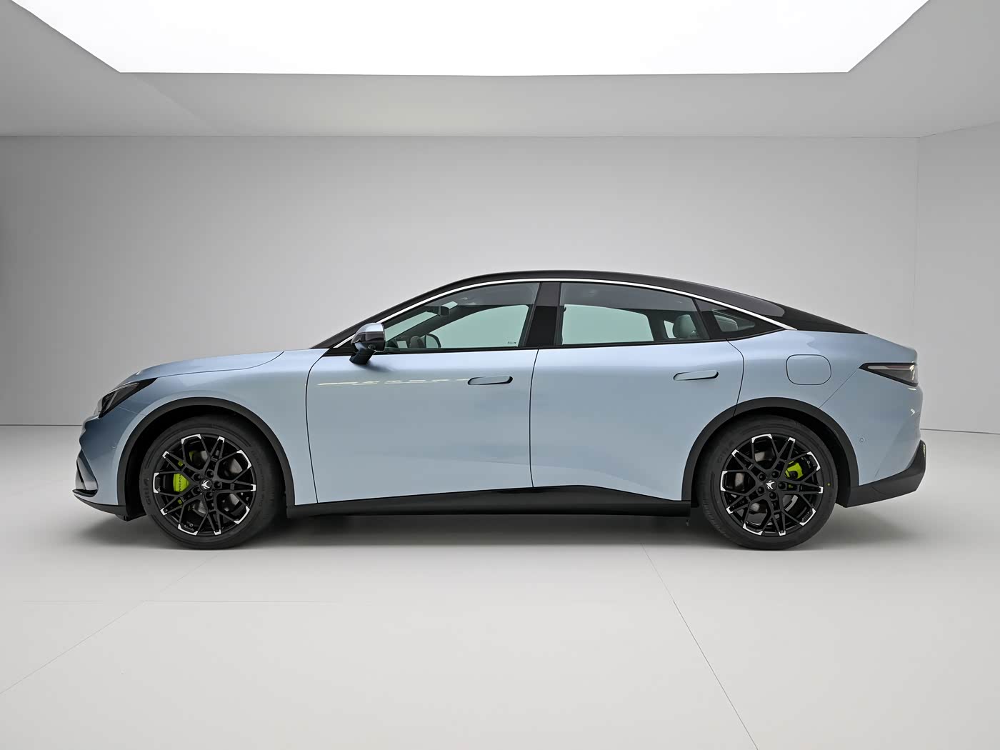 再来看车身侧面部分,极狐阿尔法S5展现出了标准的轿跑姿态,车顶线条从前到后一气呵成,流畅舒展,配合“深空星穹”大溜背设计,营造出强烈的运动气息。车身加长66mm至4886mm,搭配1930mm的宽度与1480mm的高度,以及2900mm的轴距,让车身姿态更低趴运动,内部空间也得到了充分保障。 双色悬浮车顶、无边框车门的设计,进一步强化了车辆的运动属性与时尚感。隐藏式门把手不仅提升了车身的流畅度,更是降低了风阻系数。