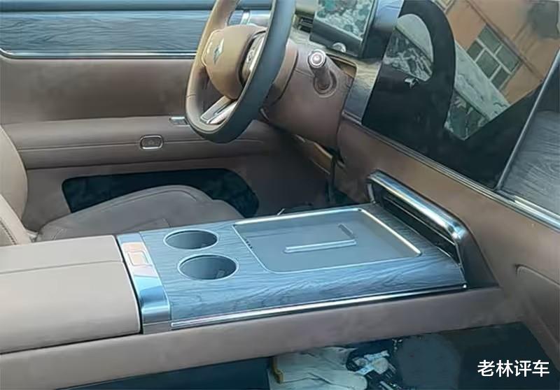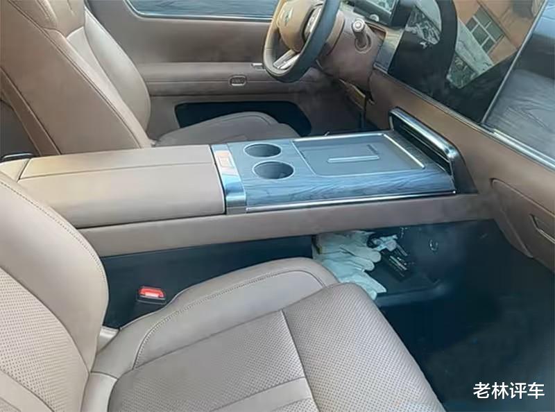 新车的前排地台采用了上下双层设计,下层是一个巨大的储物格,配备了充电接口,上层配备了两块手机无线充电面板和两个独立杯架。没有看到换挡机构,换挡机构应该位于方向盘右侧底部(电子怀挡)。