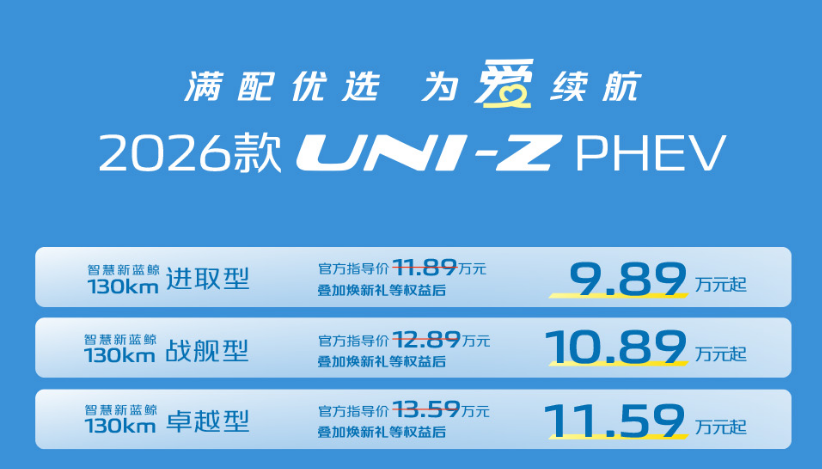 最近想选家用插混SUV的朋友,又多了一个性价比选项——长安2026款UNI-Z PHEV刚上市,叠加权益后9.89万起的价格,再加上针对家庭出行的各项配置升级,在10万级这个区间里,算是把“实用”两个字焊死了。