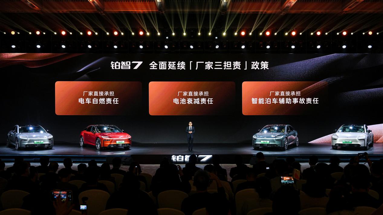 不止于权益,铂智7还有两大承诺,为用户全程兜底:三电系统终身质保,彻底打消用户使用电车的长期焦虑;厂家三担责,即电车自燃、智能泊车事故、电池衰减,均由厂家担责。