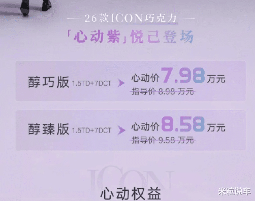 近期吉利ICON巧克力心动紫正式迎来了上市。从命名方式我们就得到答案,此次紫色的外观是该新车最大的亮点所在,厂家指导价8.98-9.58万元,限时给出了7.98万的起售价,并且紫色外观可以免费选装。