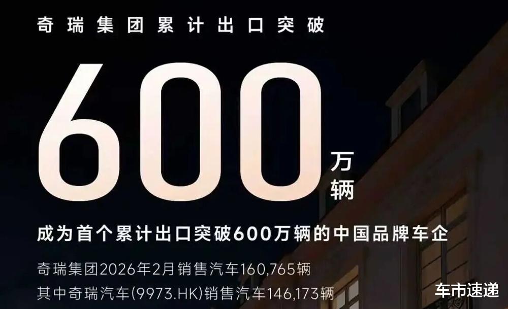 根据奇瑞集团公开的产销快报显示,集团2月销量160765台,今年前两个月累计销量超过38万台,其中,奇瑞汽车2月销量146173台。目前,奇瑞集团累计出口已突破600万台,成为首个累计出口超过600万台的中国品牌车企。