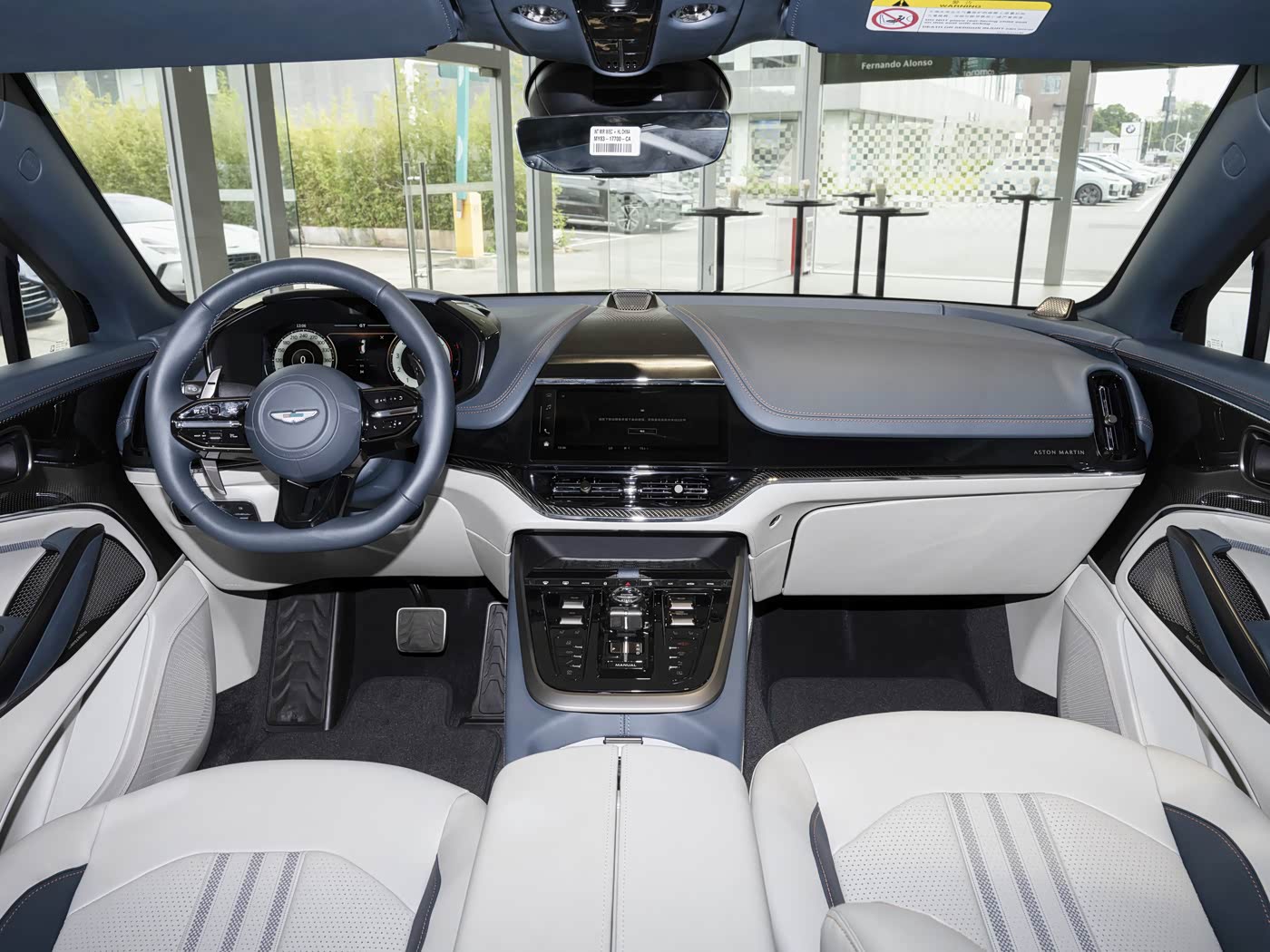 进入车内,内饰遵循阿斯顿·马丁标志性的英伦奢华设计,同时兼顾SUV的实用性与舒适性,12.3英寸全液晶仪表支持经典、运动、赛道三种显示模式,赛道模式下可实时显示G值、涡轮压力等专业数据。10.25英寸中控屏搭载最新车机系统,支持CarPlay/CarLife互联,标配的14扬声器音响系统可提供沉浸式听觉体验,空间方面,采用5座布局,前排座椅包裹性出色,支持多向电动调节、加热与通风功能,可选装按摩功能,兼顾运动感与舒适性。
