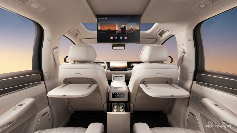 比亚迪大唐座位布局使用2+2+3的形式,第二排配备了两个带有一体式腿托的独立航空座椅,并支持一键躺平/零重力模式。配置方面,二排配备了吸顶屏,并提供了折叠式小桌板以及车载冰箱。