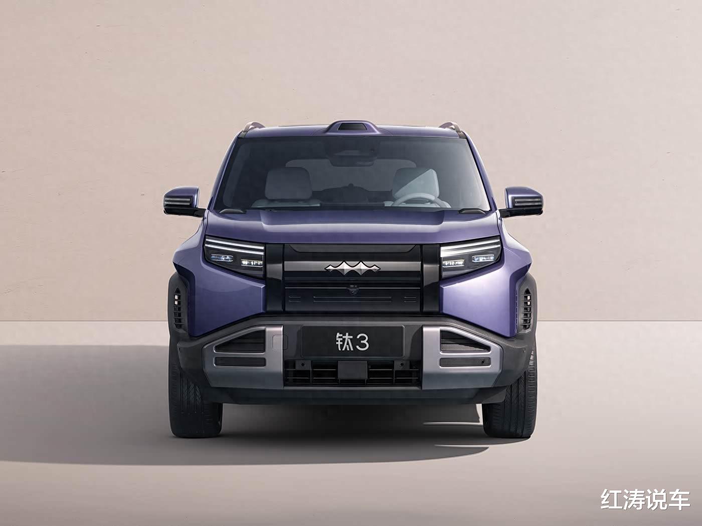 钛3闪充版的外观和现款车型基本保持不变,采用星际战舰设计风格,前脸表情有点倔强,前后宽大厚重的包围,还有带通风孔的黑色方形轮拱、尾部小书包等,使其富有野性,钛3闪充版在尾门左侧加入了“闪充”标识。