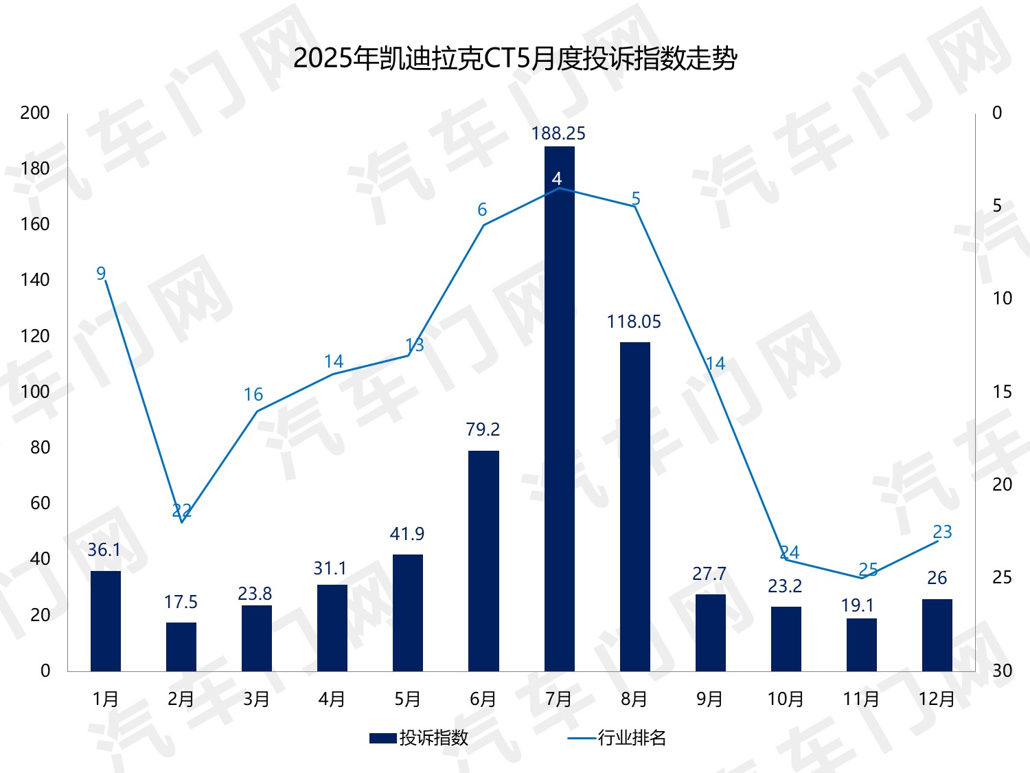 而从年度走势来看,2025年大部分时间里,凯迪拉克CT5的单月投诉指数都在50以下。6-8月,CT5的投诉指数出现了一次高峰。也正是这次大幅波动,直接推高了CT5的年度整体投诉指数。