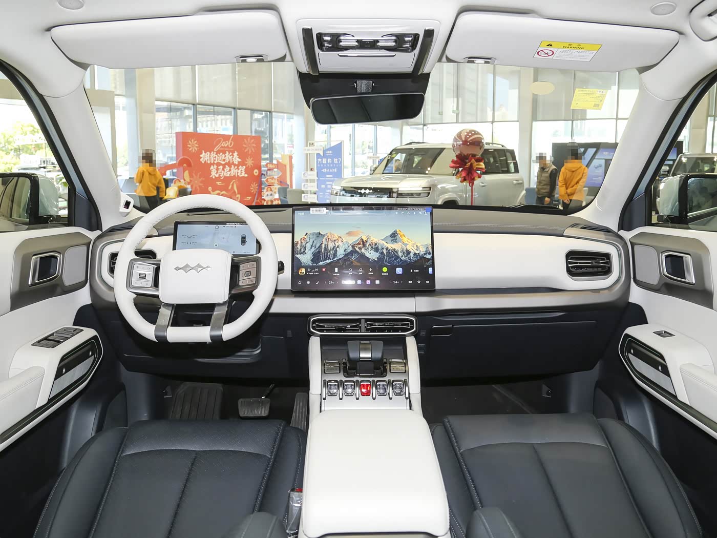 再来看车身侧面部分,方程豹钛3闪充版的硬朗风格依旧突出。分段式腰线从前翼子板延伸至车尾,勾勒出车身的层次感,搭配高高隆起的轮眉,将硬派SUV的“壮汉”形象展现得淋漓尽致。隐藏式门把手的设计,不仅让车身线条更加流畅,还能有效降低风阻。车顶配备的粗壮行李架,既提升了实用性,又为车辆增添了几分越野气息。车身尺寸方面,长宽高分别为4605/1900/1720mm,轴距为2745mm,在A级纯电SUV中表现出色,为车内空间奠定了良好基础。