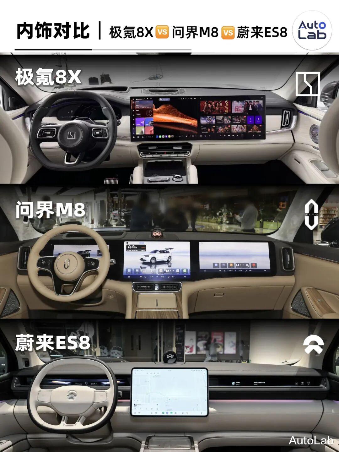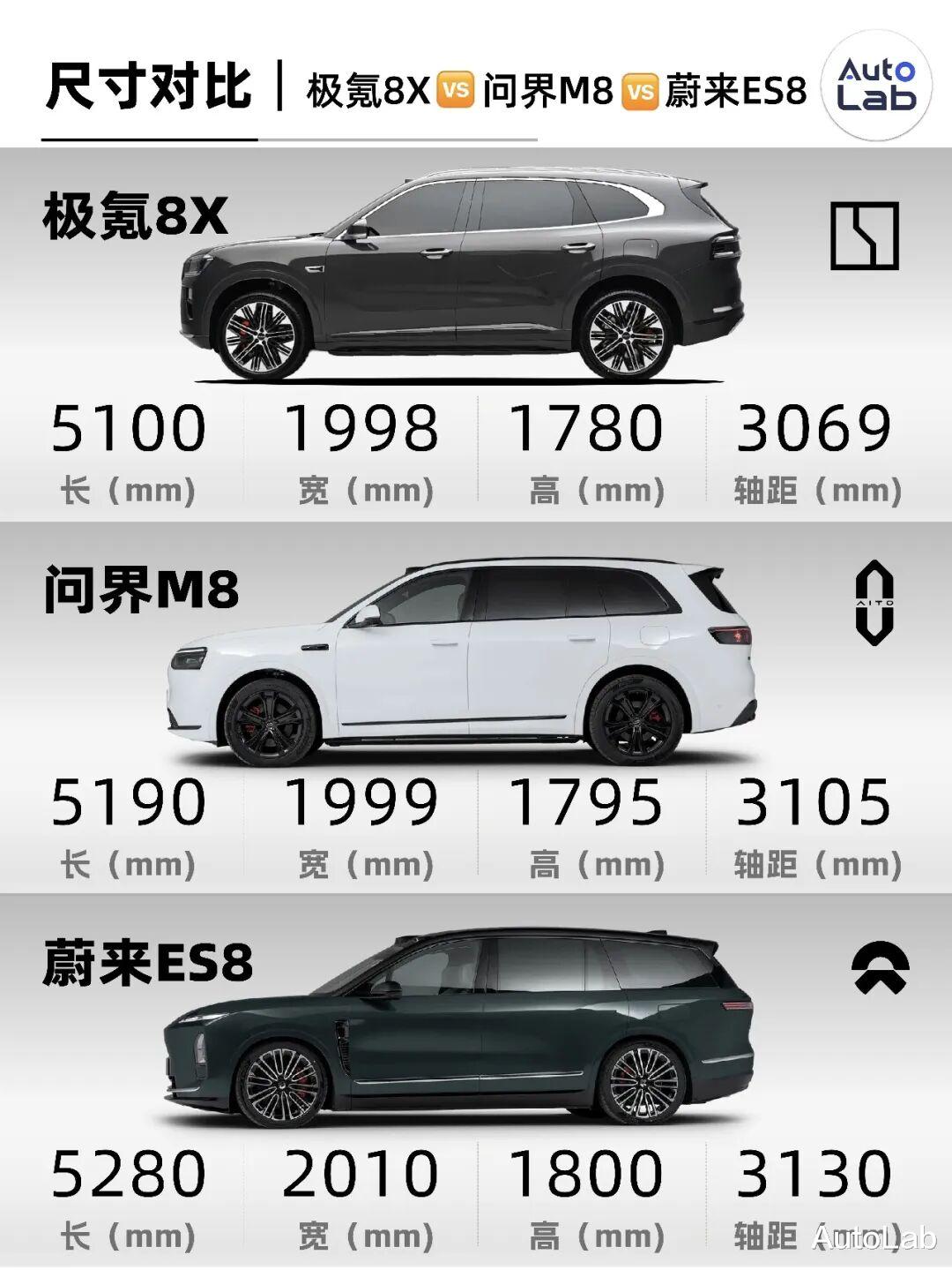 目前市面上叫“8”的SUV不少,我们挑了最热门的两台——问界M8和蔚来ES8,跟极氪8X放一起看一看。