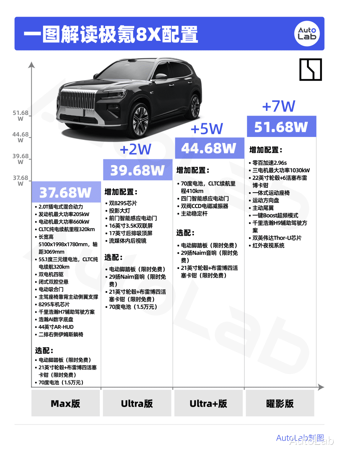 这次极氪8X一共推出了四款车型,MAX/Ultra/Ultra+以及曜影版,预售价分别为37.68/39.68/44.68和51.68万元。