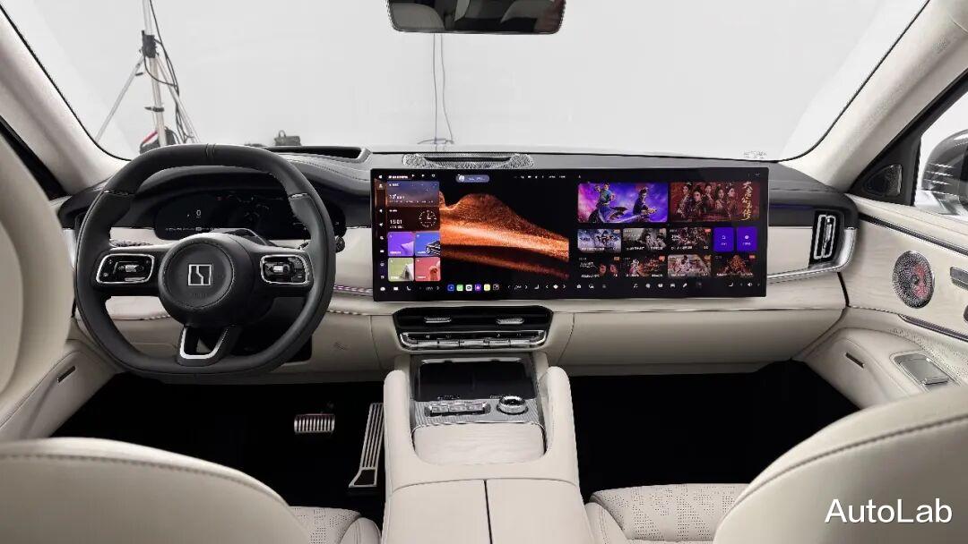 它的内饰更接近极氪001那种调性—科技感为主,运动感为辅,双16寸联屏、大量的实体按键配合上简洁的线条、用料扎实但不油腻。